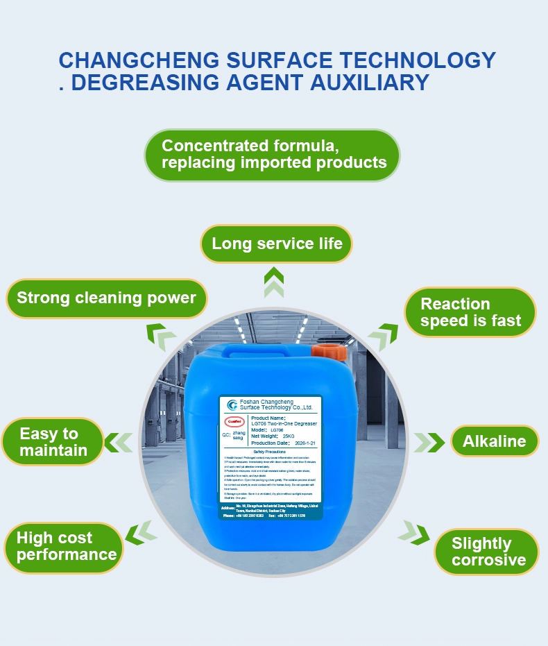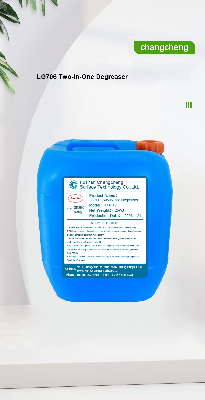 | Product Overview | This agent is compounded from a variety of surfactants, complexing agents and chelating agents. It features strong cleaning power, low ecological hazard, long service life, environmental friendliness and simple operation. Used together with 2-in-1 Conversion Coating Agent, it is specially designed for immersion degreasing 2-in-1 treatment process. |