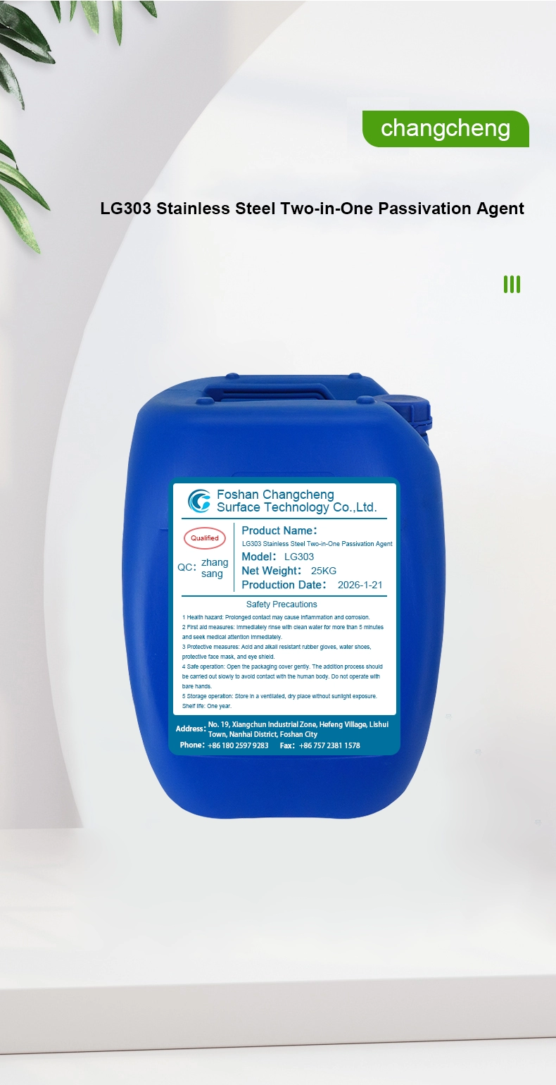 | Product Overview | LG303 Stainless Steel Two-in-One Passivation Agent is an efficient and innovative multi-functional eco-friendly treatment agent, specially designed for austenitic stainless steel (such as 304, 316) and martensitic stainless steel. It scientifically integrates the two functions of acidic degreasing (activation) and chemical passivation in a single process. Through a special formulation system, this product can quickly remove light oil stains, fingerprints and oxides from the surface of stainless steel, while immediately forming a dense and stable passivation film on the surface, significantly enhancing the corrosion resistance (salt spray time) of stainless steel. This product does not contain high-risk substances such as nitric acid, hydrofluoric acid and hexavalent chromium, and is environmentally friendly and highly efficient. |