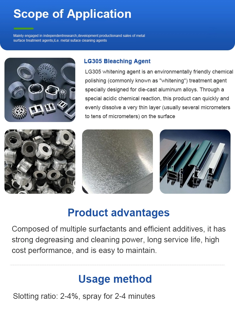 | Product Overview | LG305 Bleaching Agent is an environmentally friendly chemical polishing (commonly known as "bleaching" or "bright dipping") treatment agent specifically designed for die-cast aluminum alloys. Through a special acidic chemical action, this product rapidly and uniformly dissolves a very thin layer (typically a few to tens of microns) from the aluminum alloy surface. This effectively removes surface defects and reveals a uniform metallic luster, providing an ideal substrate for subsequent treatments. It is a safer, more environmentally friendly, and easier-to-control alternative to traditional tri-acid (nitric+phosphoric+sulfuric) polishing or chromate/fluoride-containing pickling processes. |
